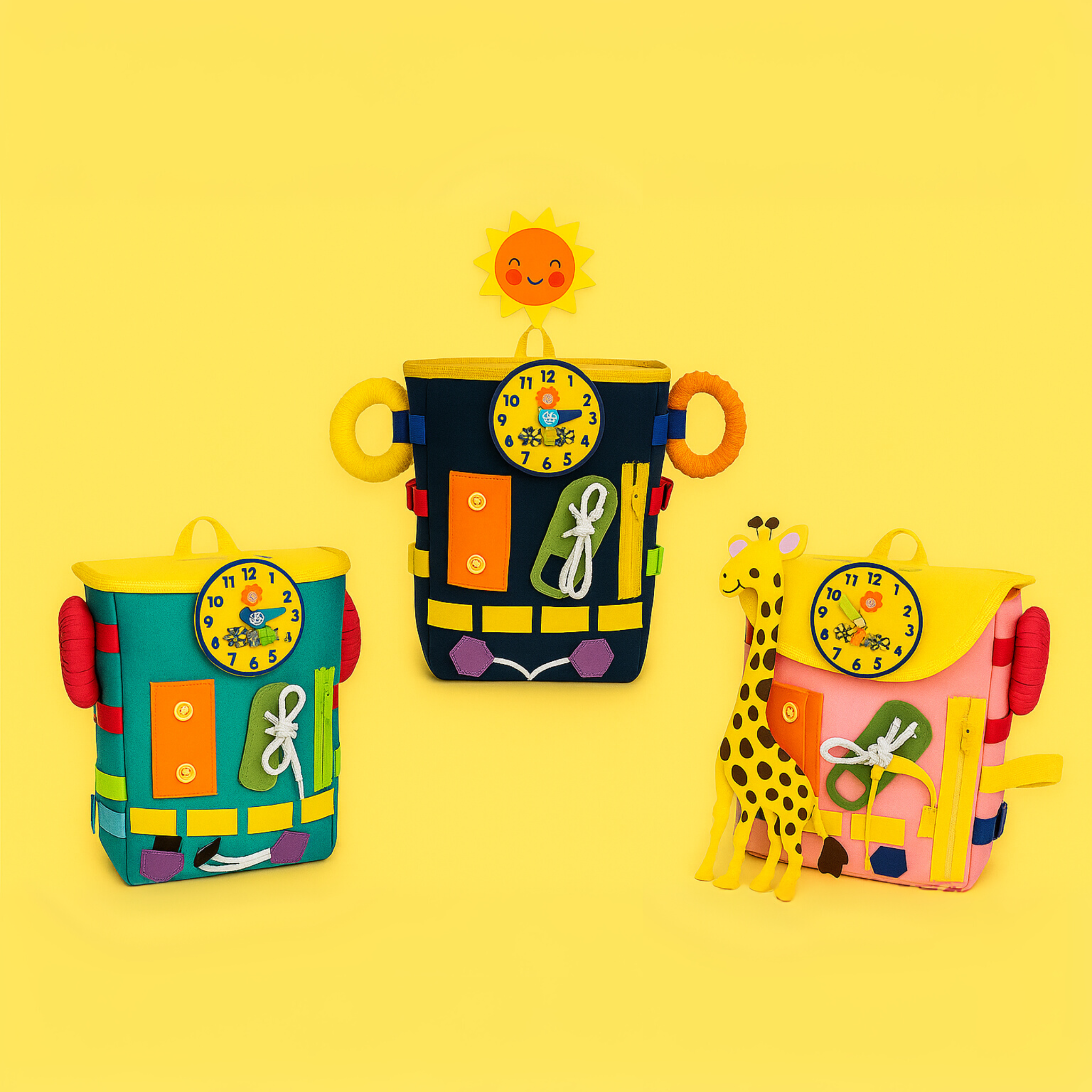 This Toddlers educational backpack is the perfect tool for learning, it has a clock, buttons, a shoe lace, buckles and many more features making it perfect for any toddler to practice their fine motor skills, this backpack also promotes problem solving and sensory education for toddlers with Autism, ADHD and High Anxiety.